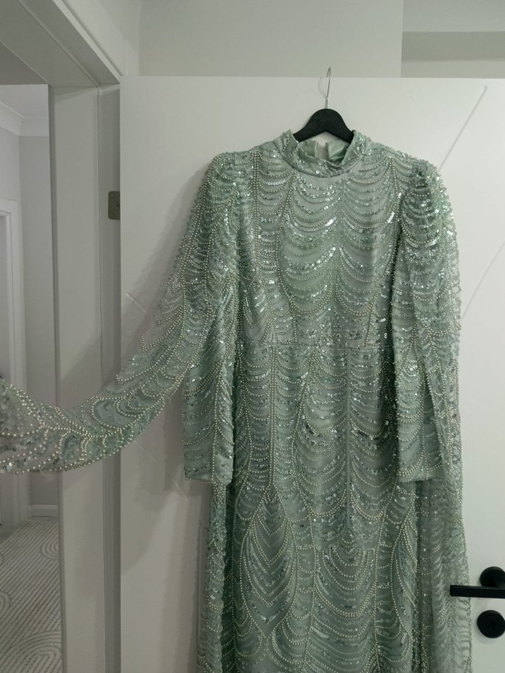 Yeşil renkte, yüksek yakalı ve uzun kollu, işlemeli desenlere sahip bol kesim bohem tarzda uzun abiye elbise. Düğünler için uygundur. ✨ nişan isteme