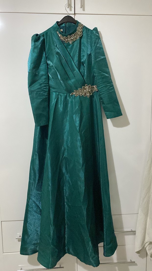 Uzun, fitted kesim yeşil abiye; drapeli, işlemeli kumaş ve notlu yaka ile vintage şıklık sunar. Uzun kollu, düğünlere uygun klasik model.