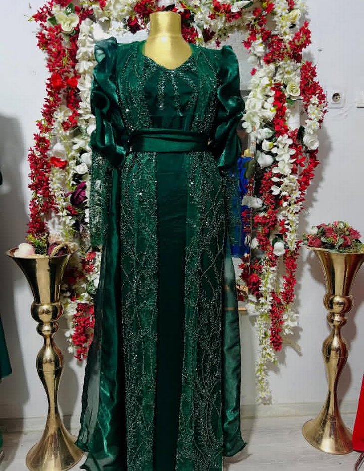 Yeşil renkli, işlemeli ve drapeli uzun kollu yöresel elbise, V yaka ve klasik kesimiyle düğünler için uygundur.