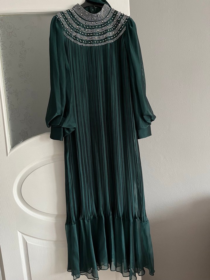 Koyu yeşil, uzun kollu, yüksek yakalı pilili ipek görünümlü kumaştan yapılmış, işlemeli detaylara sahip bol kesim bohem tarzı elbise. Düğünler için uygun.