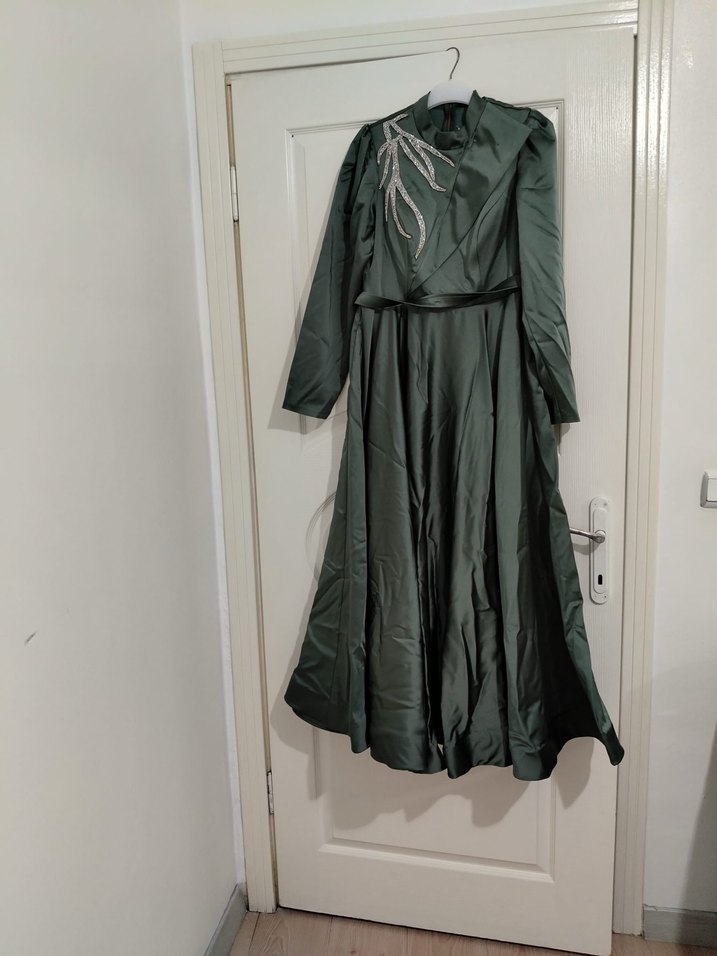 Koyu yeşil uzun kollu, yüksek yakalı ve bol kesimli işlemeli uzun elbise. Bohem tarzını yansıtır, düğünler için uygundur.