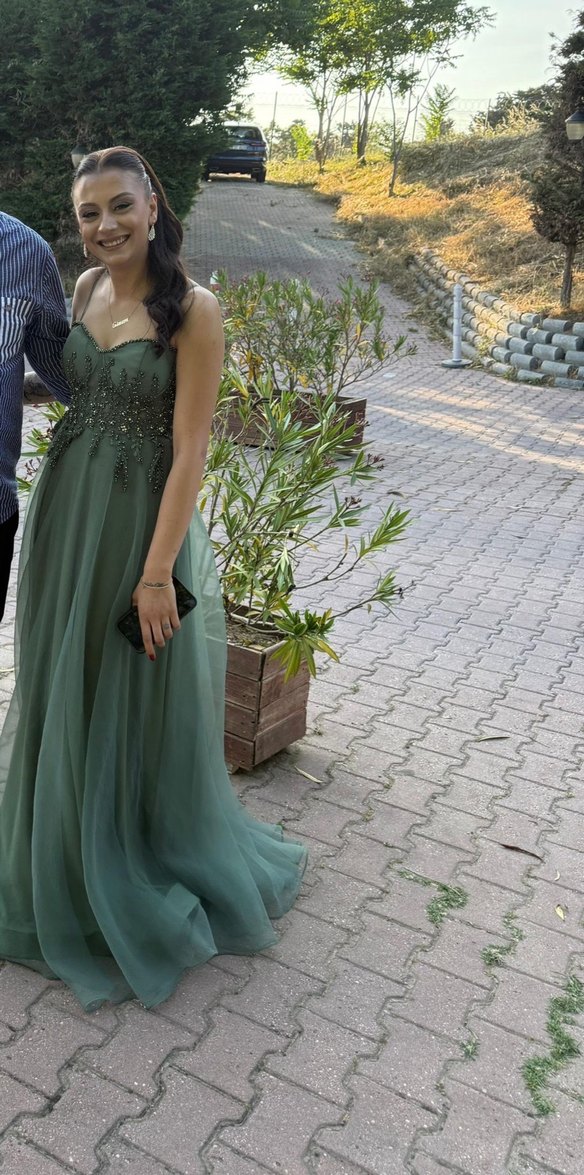 Yeşil İşlemeli Uzun Straplez Abiye Elbise
