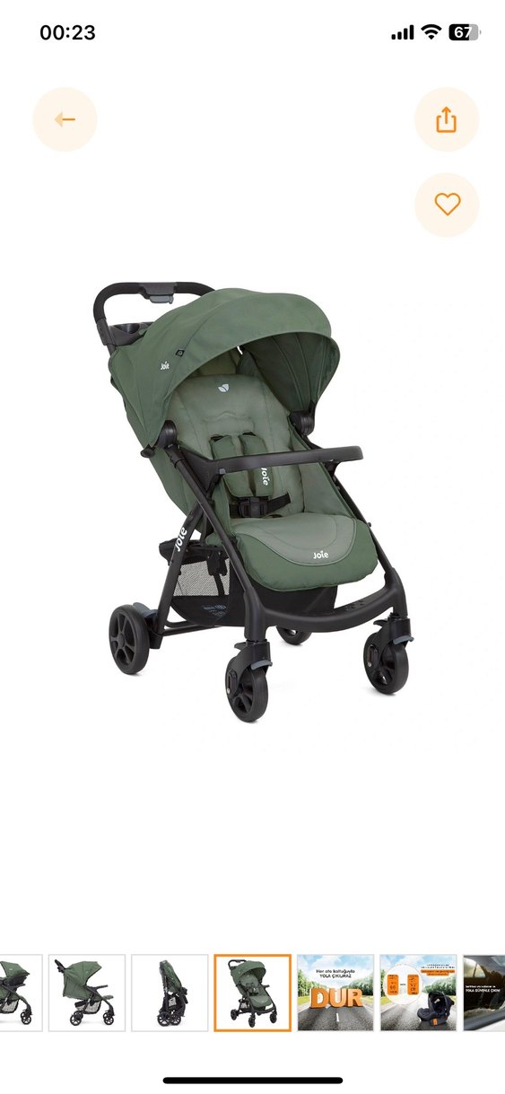 Yeşil renkte Joie marka bebek arabası, güneşlik ve güvenlik barına sahiptir. Dört tekerlekli ve alt kısmında saklama sepeti bulunur. Rahat ve güvenlidir.