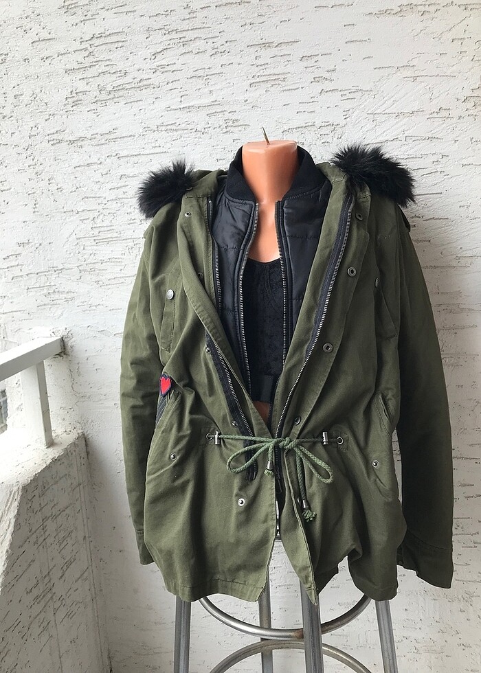 Çok şık yeşil kaban az defa tertemiz kullanıldı S & M bedene uygundur iki mont gibi içindeki çıkabiliyor sıcacık tutuyor kapşonu lü