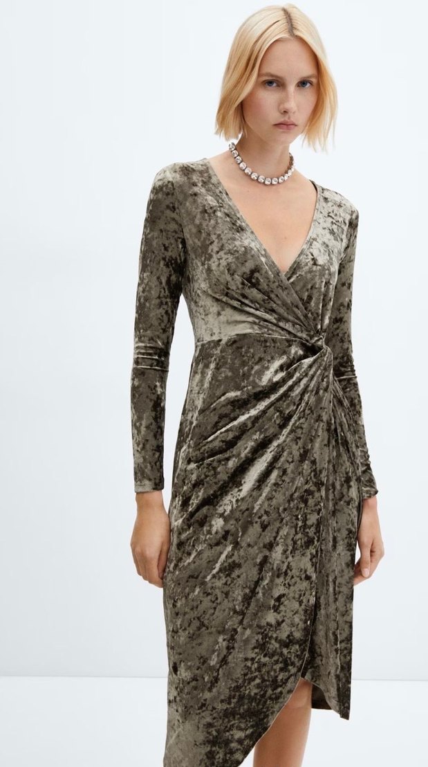 Derin V yakalı, drapeli ve bağlama desenli yeşil kadife kumaştan, uzun kollu ve klasik şıklıkta dar kesim abiye elbise. Romantik akşamlar için uygundur.