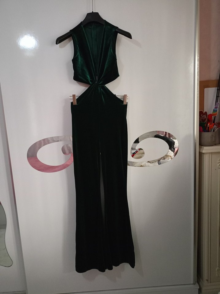 Uzun, fitted kesim yeşil baskılı sentetik kumaştan yapılmış, kolsuz ve straplez tasarımlı, beli kemerli kadın tulumu. Avant-garde parti stiline uygun.