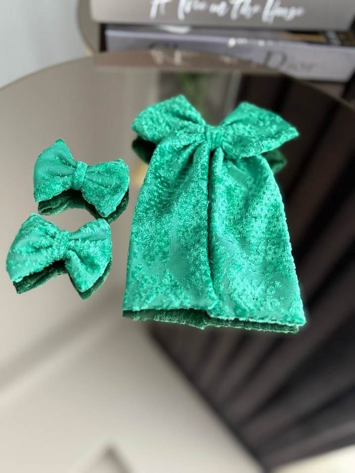 Renkli yeşil bağlamalı bebek kız elbise seti, bağlamalı detay ve tie-dye desenine sahiptir.