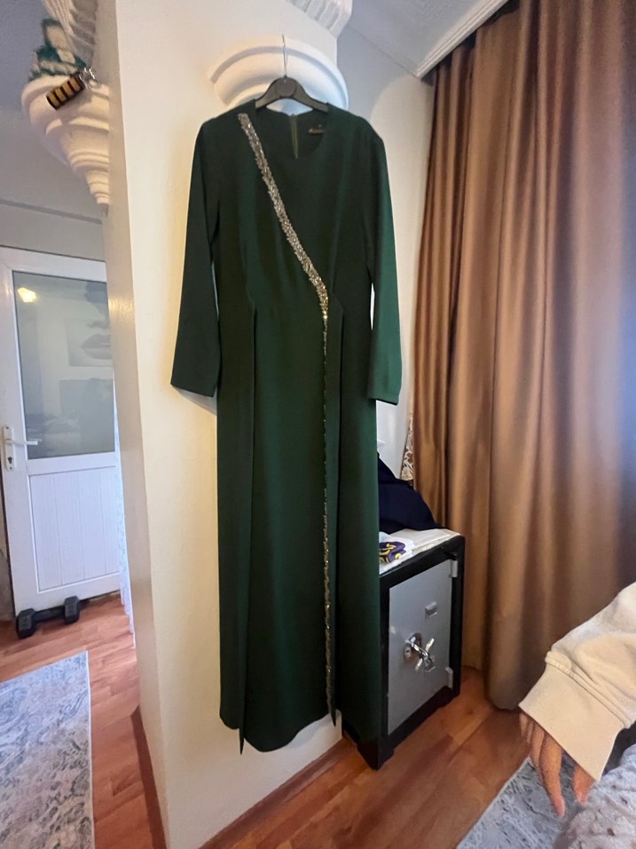 Yeşil parlak renkte, uzun kollu, işlemeli ve drapeli modern klasik kadın abiye. Notched lapel yakalı, rahat kesim. 1 defa giyilmiştir defosu falan bulunmamaktadır temizdir.