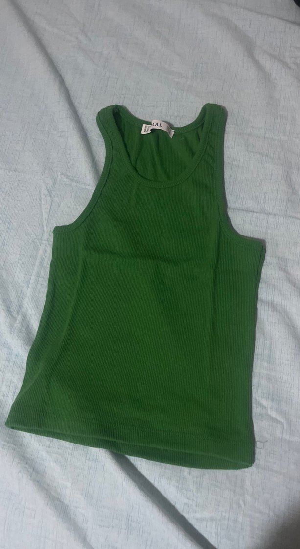Düz yeşil, askısız yakalı, vücuda oturan kadın atlet, yumuşak sentetik kumaştan, günlük kullanım için uygun.