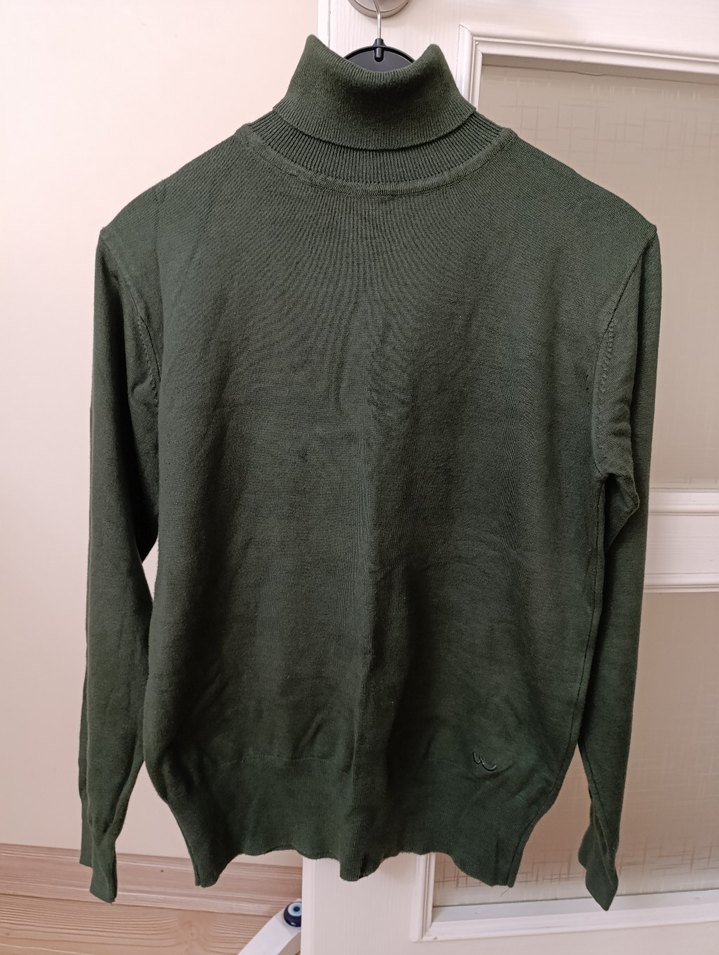 Yeşil renkli, balıkçı yaka ve uzun kollu, ince keten kumaştan yapılmış, günlük kullanıma uygun normcore tarzda, dar kesim triko kazak.