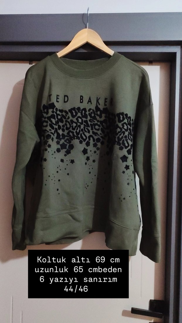 Uzun kollu, yuvarlak yaka ve baskılı desene sahip yeşil kadın sweatshirtü, rahat kesim ve yumuşak, sıcak tutan kumaştan yapılmıştır. Kol altı 69 cm, uzunluk 65 cm'dir.