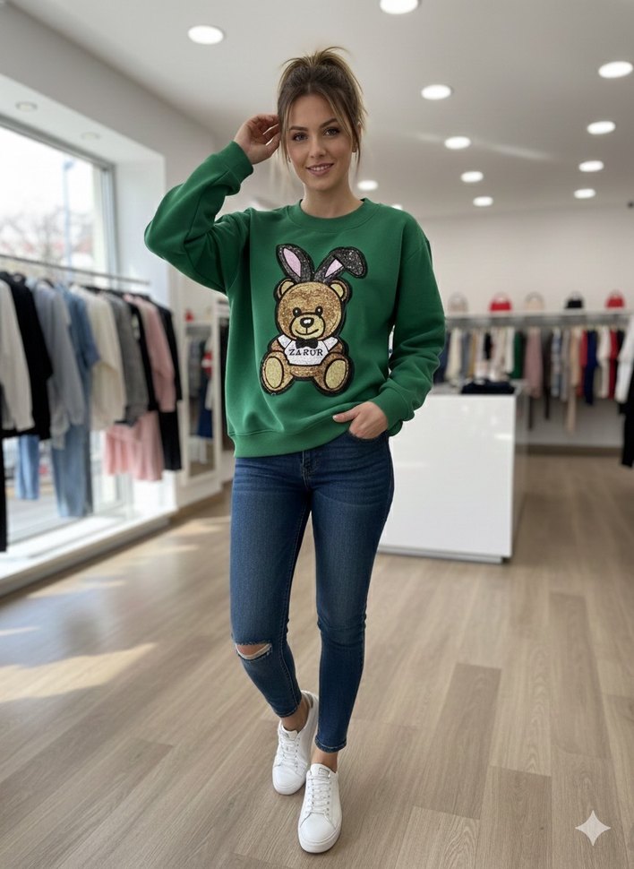 Yeşil renkli, rahat kesim, bisiklet yaka ve uzun kollu sweatshirt. Parlak baskılı peluş detaylı ayı figürü bulunur. Yumuşak ve sıcak kumaştan, günlük kullanıma uygun.