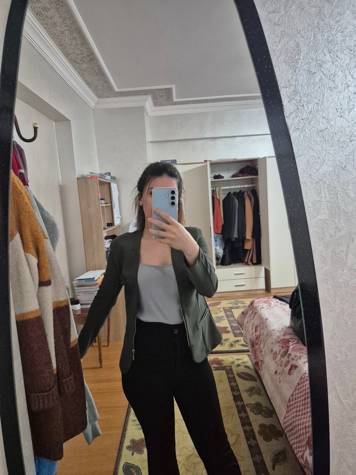 Ofis için uygun, uzun kollu, kesimli yeşili blazer, kesik yaka ile tamamlanmıştır, ince rahat ve mevsimliktir