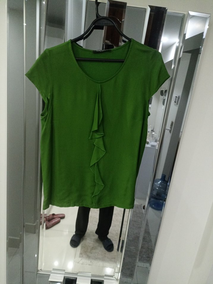 Yeşil kadın bluz, yuvarlak yaka ve kısa kolludur. İpek gibi dokusu ve ön kısmındaki fırfır detayıyla günlük kullanıma uygundur. arka sırf pamuk on pamuk saten yepyenidir