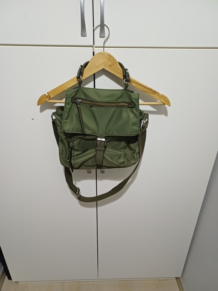 Yeşil renkte, kemerli ve çoklu fermuarlı cepleriyle düzenli kullanım sağlar. Minimalist tarzıyla sokak modasına uygundur. resimdede belirttiğim gibi ön kısmında küçük bir yanık var