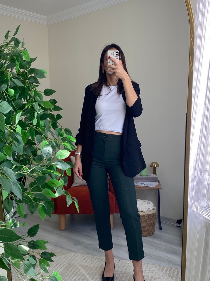 Zara cigarette pantolon Canlı yeşil rengiyle her kombine enerji katıyor! ✨Şık duruşu ve rahat kalıbıyla dolabınızın favorisi olacak.