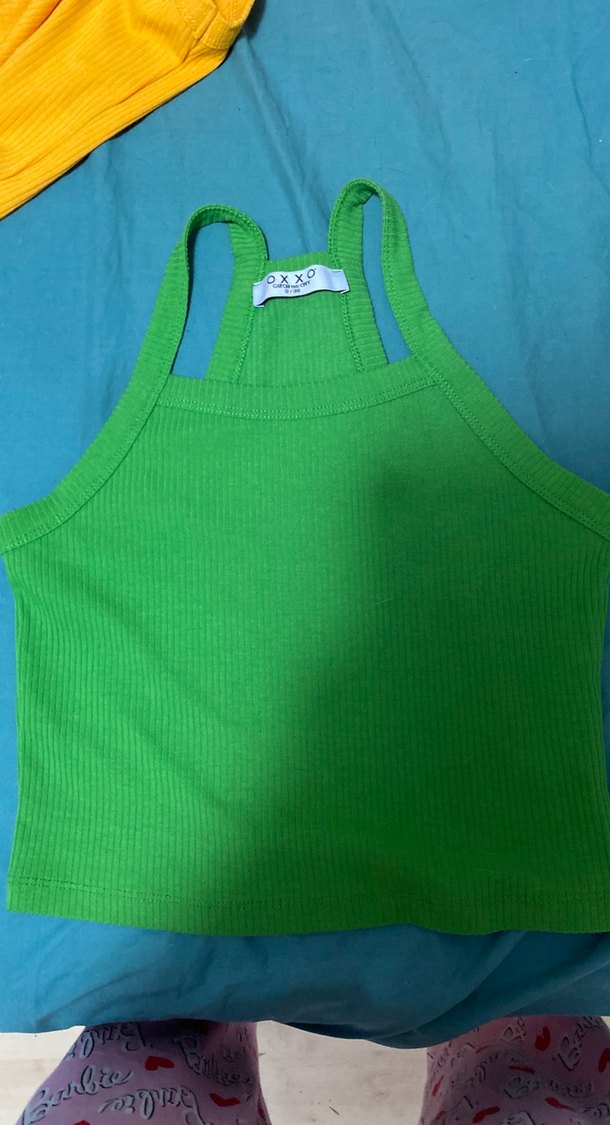 Yeşil renkte, yüksek yakalı ve kolsuz, vücuda oturan midi uzunlukta kadın atlet. Yumuşak sentetik kumaştan, pastel tonlu, trend sokak stili için uygun.