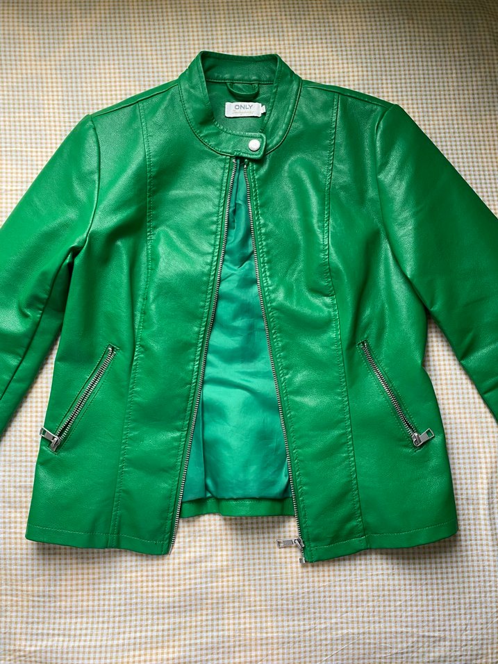 Fermuarlı cepleri ve çentikli yaka detayı olan, parlak yeşil deri biker ceket. Uzun kollu ve günlük kullanıma uygun.