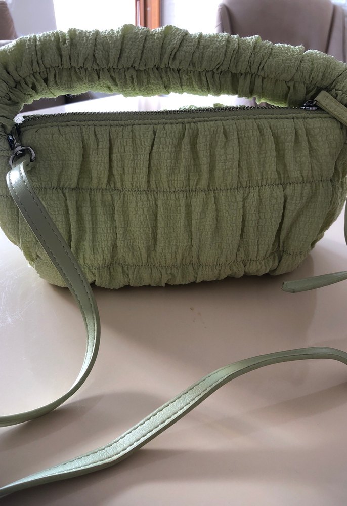 Yeşil renkli, fermuarlı ve dokulu sentetik kumaştan yapılmış kadın çantasıdır. Pastel tonları ve desen içermeyen tasarımı günlük sokak modasına uygundur. Ayarlanabilir askısı vardır.