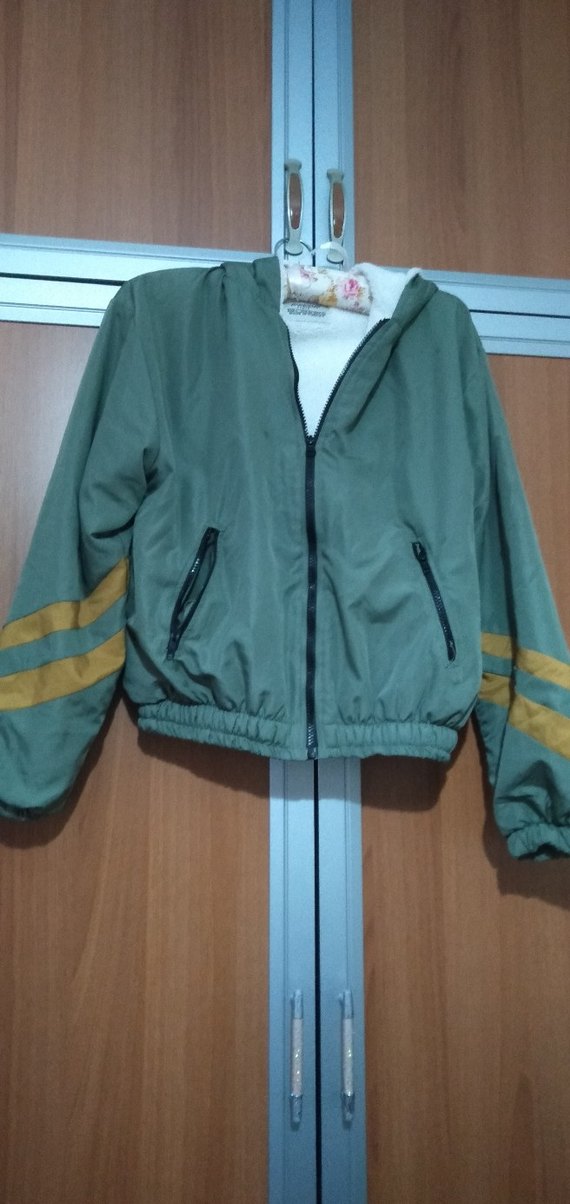 Yeşil renkli, bol kesim, yüksek yakalı ve uzun kollu kadın spor ceketi. Fermuarlı cepleri ve yumuşak, sıcak dokusu vardır. Günlük kullanıma uygundur.