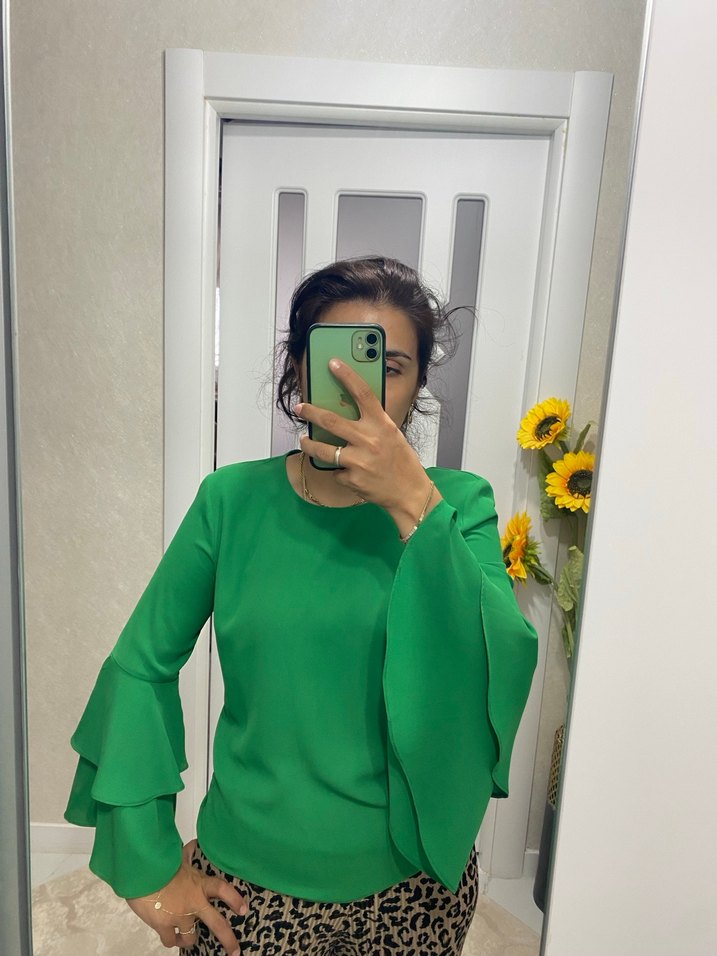 Salaş kesim, uzun kollu, fırfırlı detaylı yeşil bluz. Yuvarlak yaka ve normal boyda, gündelik sokak stiline uygun.