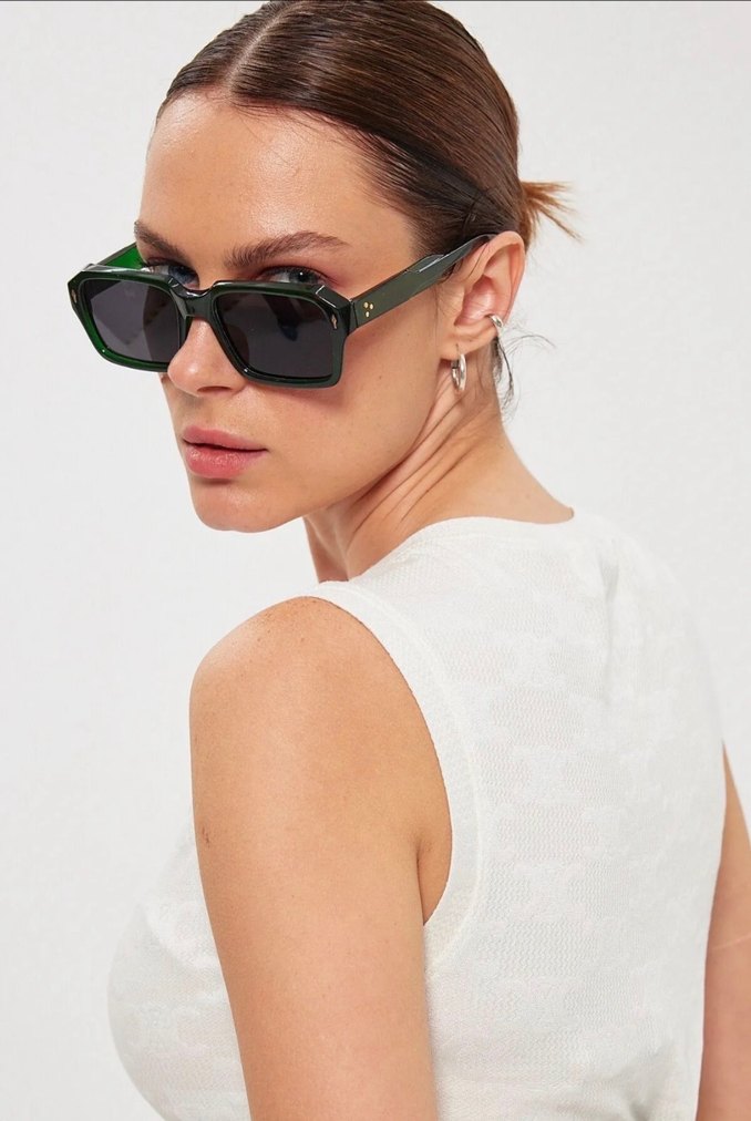Yeşil çerçeveli ve gri camlı kadın güneş gözlüğü, rahat ve şık sokak stili için ideal.️