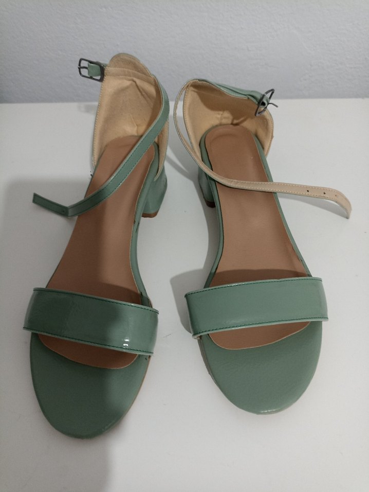 Yeşil, tokalı bantlı, blok topuklu kadın sandalet. Pastel tonlarda, minimalist ve düz tasarıma sahip kauçuk malzeme.