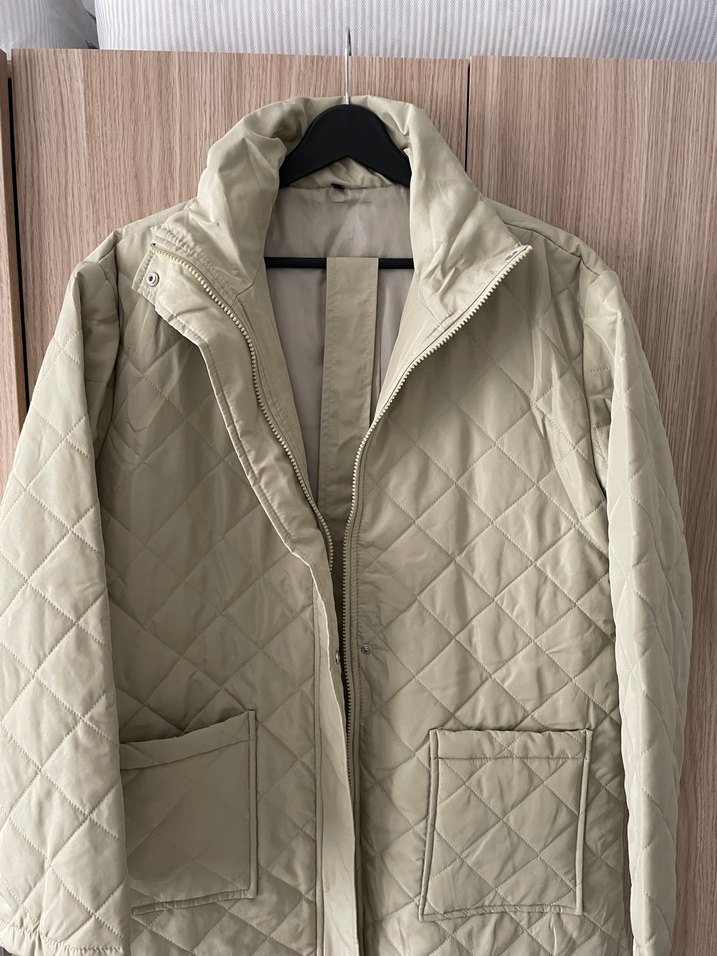 Açık yeşil renkte, kapitone desenli kadın mont, normal kalıp ve uzun kolludur. Sentetik kumaştan üretilmiş, fermuarlı ve midi boydadır. Günlük kullanıma uygundur. Kemeri mevcuttur . Hiç kullanılmamıştır