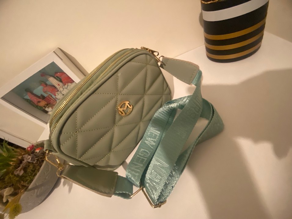 Pastel yeşil renkli, kemerli ve kapitone desenli kadın çantası, sentetik kumaştan üretilmiş, trend sokak stili için uygundur.