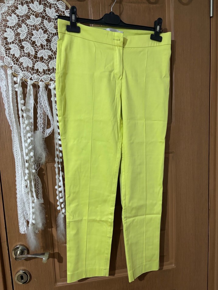 Yeşil kadın pantolon, regular fit ve kemerli bel detayına sahip, yumuşak sentetik kumaştan üretilmiştir. Ofis ve günlük kullanıma uygundur. Bir tık geniş bedenine göre.