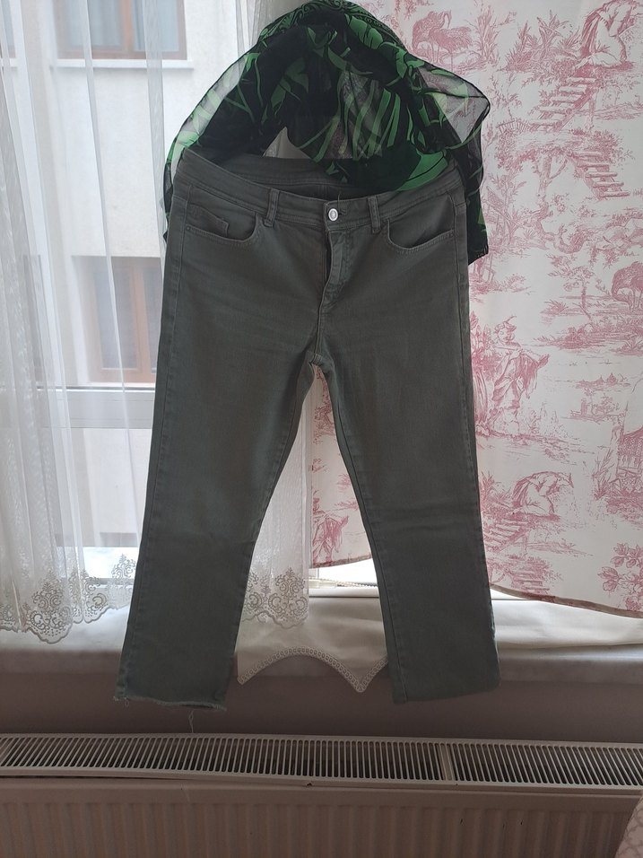 Kadınlar için yeşil kumaş pantolon. Belli bir süre kullanıldı. Bir kusuru yok. Yumuşak sentetik kumaştan, günlük kullanım için midi boyda.
