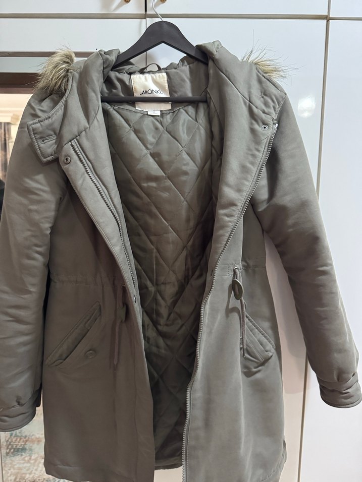 yeşili renkte, midi boy ve normal kesim olan bu kadın kışlık mont, kürk detaylı kapüşon ve kesik yakaya sahiptir. Uzun kollu, yumuşak ve sıcak dokulu kumaştan üretilmiş, günlük rahat sokak stili için uygundur. ❄️