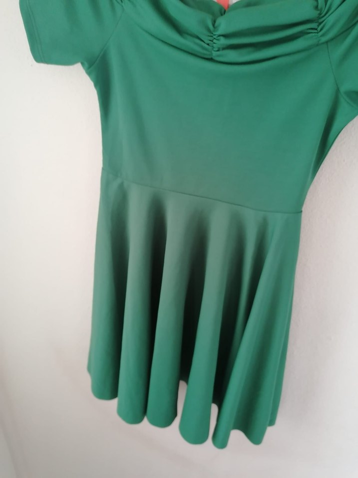 Yeşil midi elbise, tek renk, kısa kollu ve tekne yaka. Üst kısmı vücuda oturur, etek kısmı pilili ve geniş kesimdir. Yumuşak sentetik kumaştan üretilmiştir.