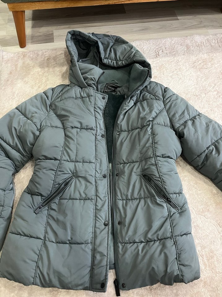 Yeşil renkte, kapüşonlu ve uzun kollu kadın midi kaban. Yumuşak ve sıcak kumaştan, kürk detaylı ve fermuarlı ceplidir. Dış mekan kullanımı için uygundur. ❄️