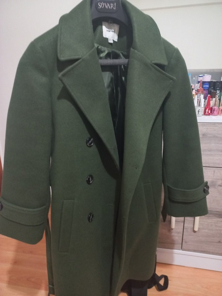 Yeşil renkte, yün kumaştan üretilmiş, normal boy midi kaban. Düğmeli ve keskin yaka detaylı, uzun kollu, ofis için uygun, sade tasarımlı.