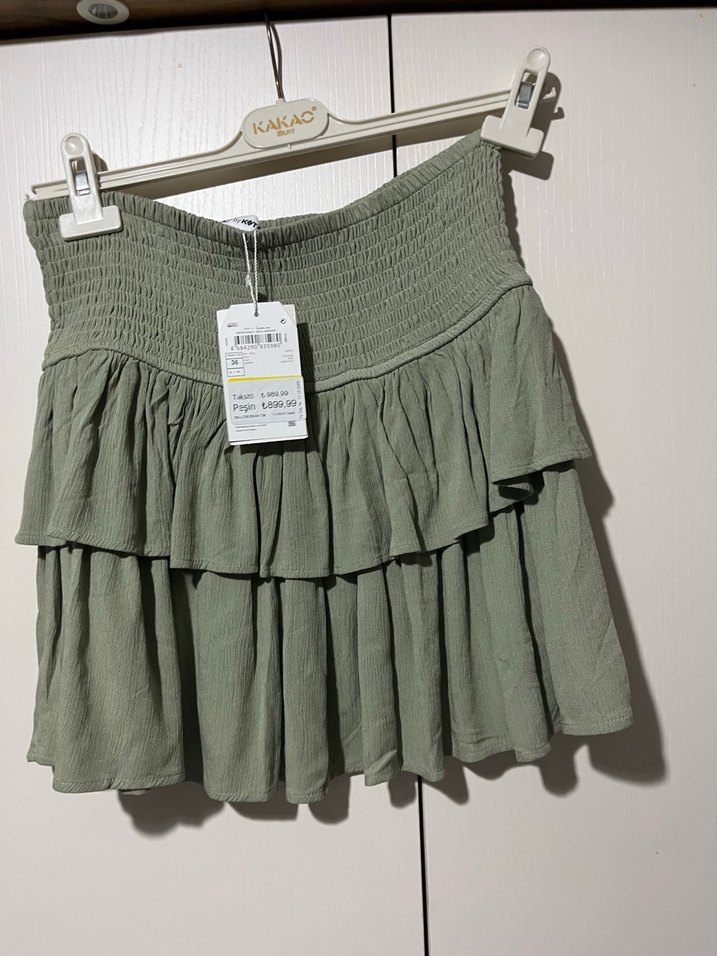 Yeşil renkli, keten kumaştan yapılmış, fırfırlı ve işlemeli desenli, bol kesim mini etek. Günlük rahat bohem stil için uygundur.
