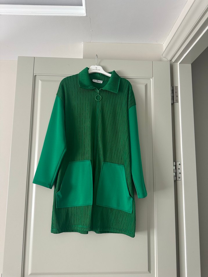 Parlak yeşil renkte, uzun kollu ve yüksek yakalı kadın triko mini elbise. Regular fit ve pile detaylara sahip, sokak stili ile minimalist dokunuşu bir arada sunar. Yumuşak kumaştan, günlük kullanıma uygun.