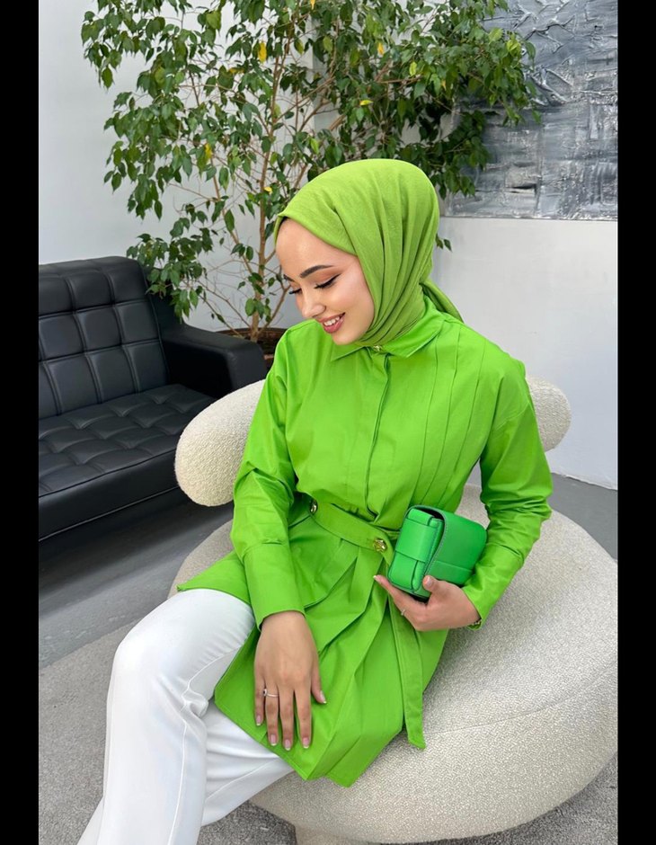 Açık yeşil renkte,ikadın mini tunik. Uzun kollu, yüksek yakalı ve drapeli tasarımıyla günlük sokak stiline uygundur. Sentetik kumaştan konforludur.