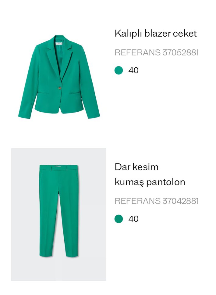 Yeşil renkte, kalıplı blazer ceket ve dar kesim kumaş pantolondan oluşan kadın ofis takımı. Uzun kollu, kemerli ve düz tasarımlıdır. Yalnızca ceketi 1 kez, özel bir etkinlikte birkaç saat giydim. Pantolonu hiç giymedim. Çok güzel bir yeşil tonu var. Tertemiz ve çok şık bir ürün . Ölçüleri görsellerde bulunuyor.