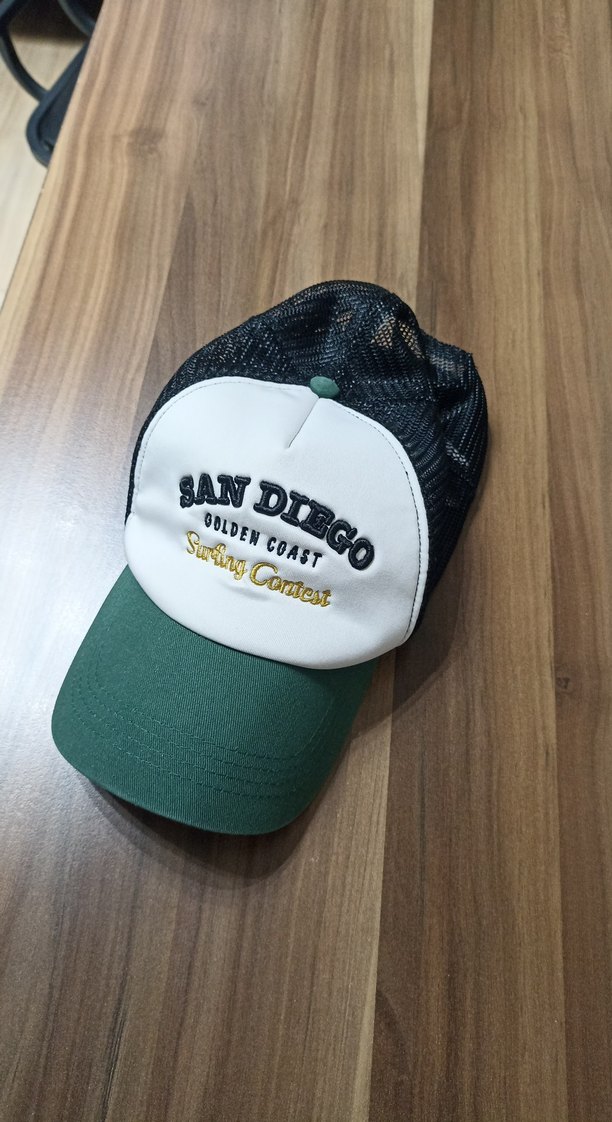 Bu kadın pamuklu şapka, yeşil siperliği, beyaz ön paneli ve 'San Diego Golden Coast' nakışı ile siyah file arka kısımdan oluşur. Ayarlanabilir velcro bantlı, retro bohem tarzını yansıtır.
