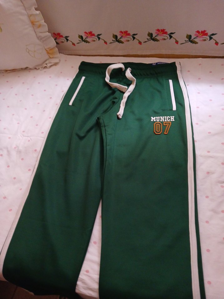 Yumuşak kürk dokulu, fermuarlı cepli ve baskılı detaylı yeşil, rahat kesim kadın eşofman altı. Beyaz yan şeritler ve 'MUNICH 07' baskısı bulunur. Spor ve gündelik kullanım için uygundur. ♀️
