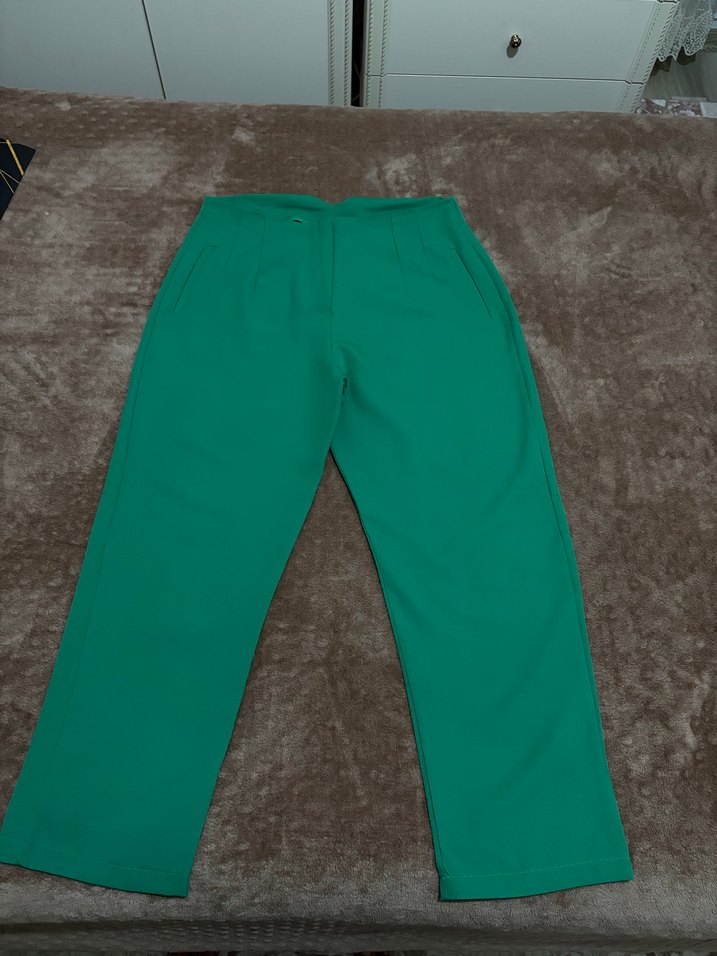 Yeşil renkli, rahat kesim ve midi boy kadın pantolon, yumuşak ve sıcak kumaştan üretilmiştir. Renkli ve zahmetsiz şıklık sunar, günlük kullanım için uygundur.