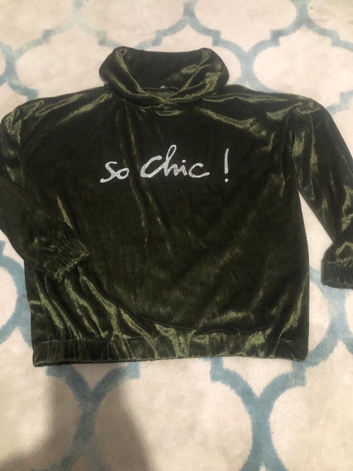 Yeşil renkli kadın sweatshirtü, uzun kollu ve salaş kesimdir. Parlak sentetik kumaştan örme dokusuyla üretilmiş, önünde 'so chic !' baskısı vardır. Rahat ve şık bir görünüm sunar.