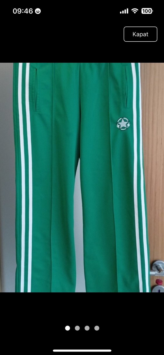 Yeşil, parlak sentetik kumaştan yapılmış, rahat kesim ve normal boyda kadın eşofman. Fermuarlı cepler ve beyaz yan çizgiler bulunur. Spor sokak giyimi için uygun. ♀️