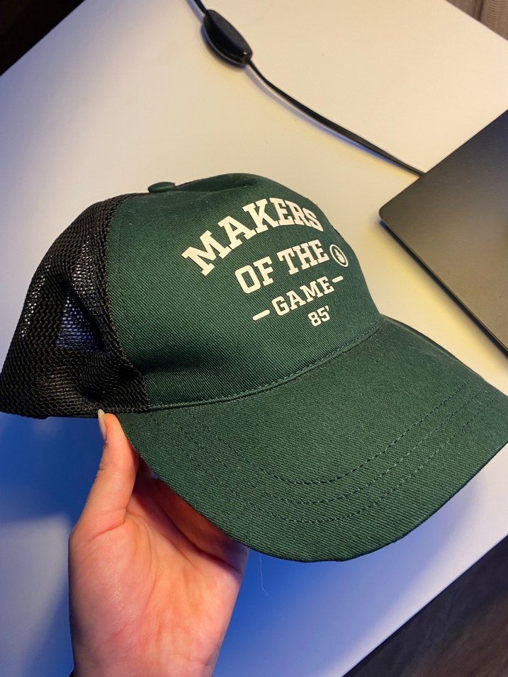 Velcro ayarlı koyu yeşil kadın spor şapka. Beyaz baskılı yazı ve nefes alabilen file arka kısım içerir. Athleisure tarzında.