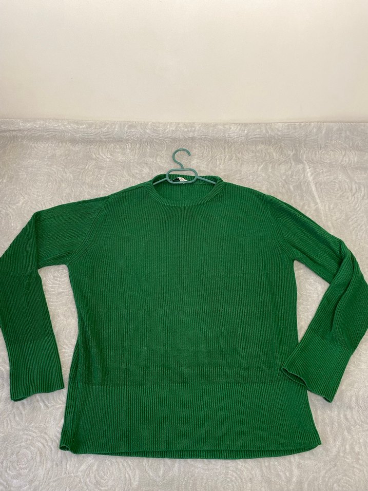 Yeşil renkte, uzun kollu, yuvarlak yakalı ve bol kesim kadın triko kazak. Yün malzemeden örülmüş, sade ve rahat bir stil sunar. Günlük kullanım için uygundur.