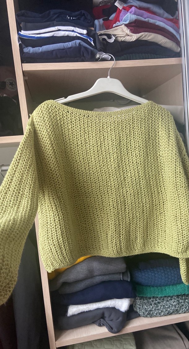 yeşil renkli, yuvarlak yakalı ve uzun kollu kadın triko kazak. Rahat, salaş kesimi ve midi boyuyla günlük kullanıma uygundur. el örgüsüdür