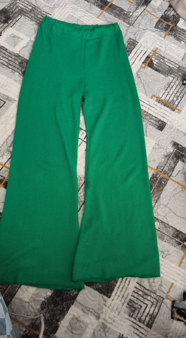 Uzun, yeşil renkli kadın pantolonu, triko dokulu ve sentetik kumaştan üretilmiştir. Rahat kesimiyle sokak stiline uygun, renkli ve konforlu bir tasarımdır.
