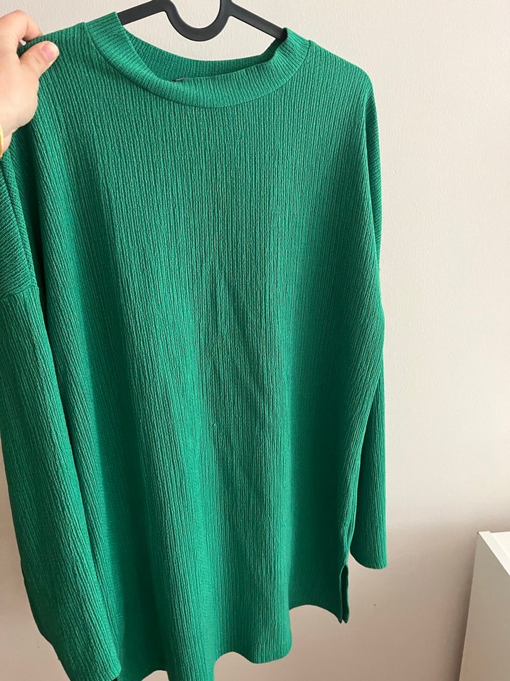 Yeşil renkte, triko dokuma, yuvarlak yaka ve uzun kollu kadın kazak. Yumuşak keten kumaştan, bol kesim ve midi boyda, günlük rahat kullanım için uygun.