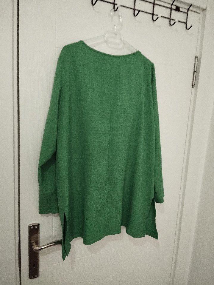 Yeşil renkli kadın triko tunik, yuvarlak yaka ve uzun kolludur. Yumuşak keten kumaştan, bol kesim ve midi boydadır. Örgü dokusu günlük kullanım için rahatlık sağlar.